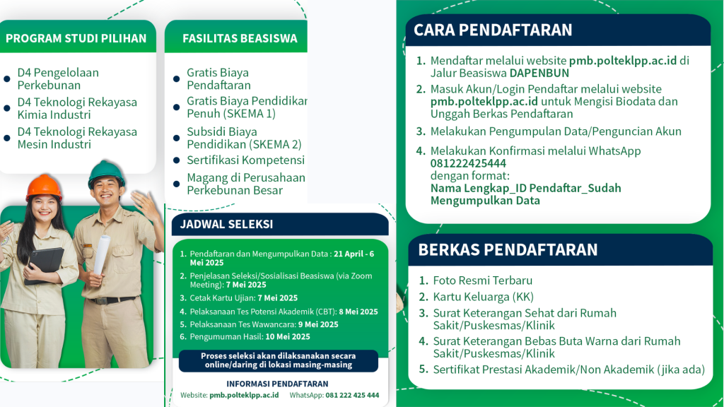 Jangan sia-siakan kesempatan emas ini. Bahkan, Beasiswa DAPENBUN 2025 adalah jalan bagi kamu yang ingin kuliah tanpa beban biaya, mendapatkan pengalaman magang yang berharga, dan menjadi SDM unggul di bidang perkebunan.